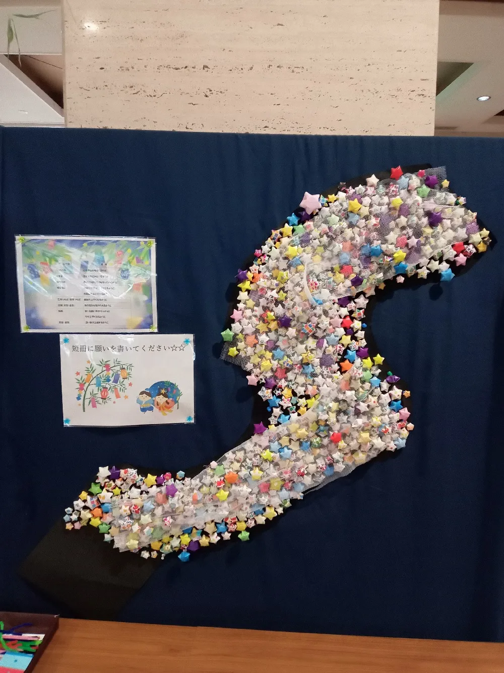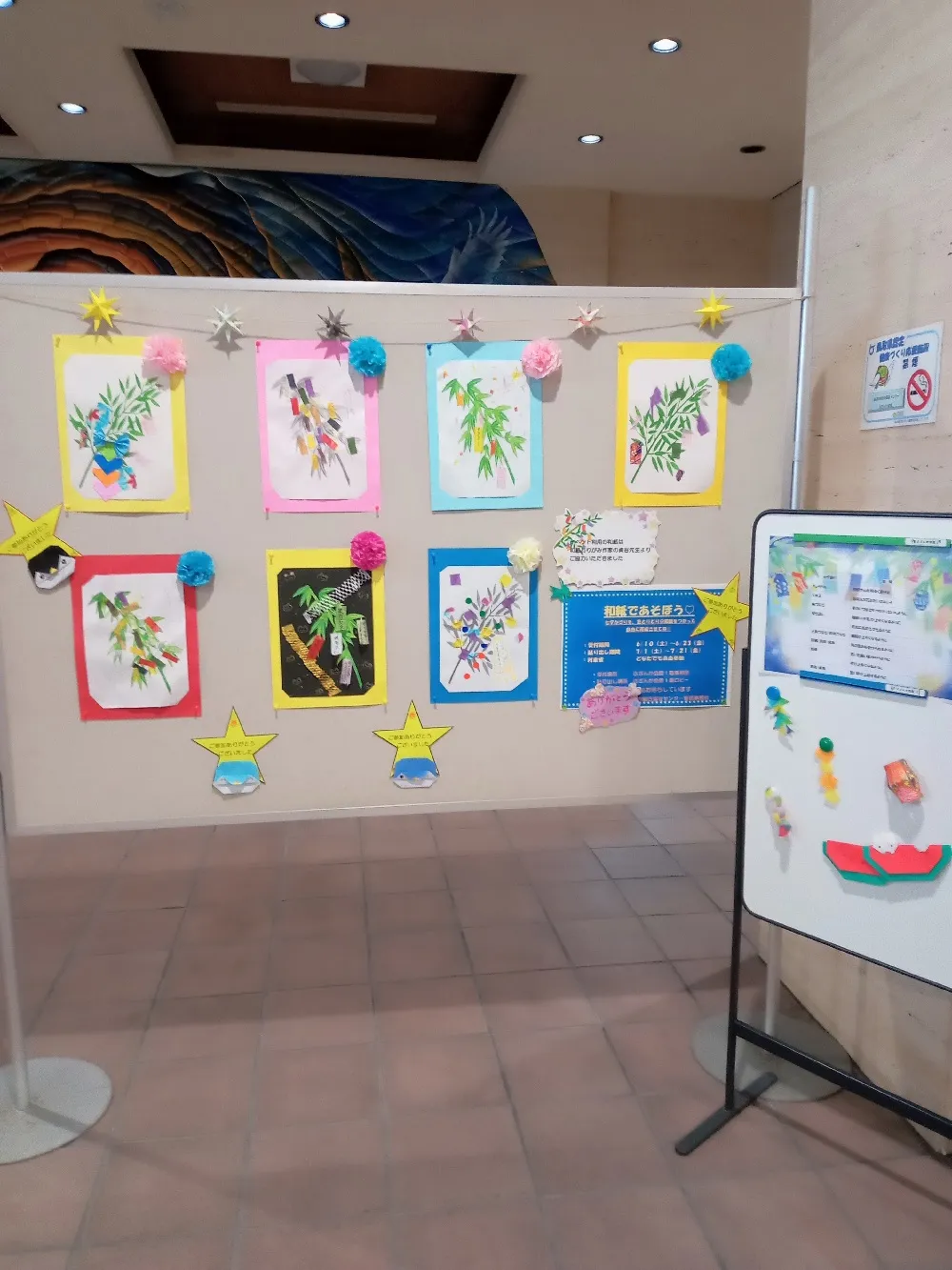 ちぎり絵での作品や折り紙での天の川などステキな作品が飾ってあります。